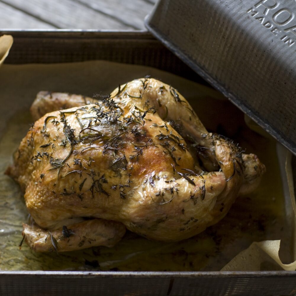 In the warmer months, I serve this with a simple salad (some sliced tomatoes drizzled with good olive oil, and scattered soft goat’s cheese and tarragon or basil leaves) along with a bowlful of tiny mint-flavoured new potatoes. Or, if the weather is cooler, I’ll sit some parsnips, pumpkin, potatoes and onions around the chook as it cooks and we’ll have a ‘proper’ roast with all the trimmings.