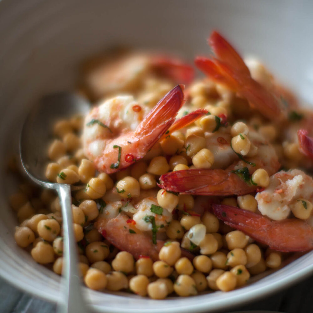 I don’t really know what it is about prawns and chickpeas that make their flavours go so well together; the sweet, brininess of the prawns seems to be just the right foil for the slightly nutty chickpeas. In this simple salad the two combine beautifully, tied together by fragrant basil which adds its warm liquorice-like note to the mix. The only thing you need with it is plenty of warm Turkish bread to mop up every skerrick of the truly delicious juices. (If you would prefer to use canned chickpeas, you will need 2 x 400g cans, drained and rinsed well under cold water before using.)